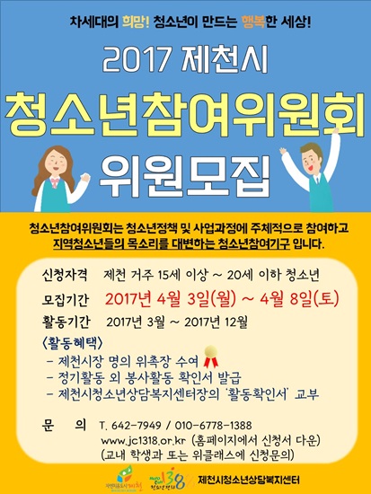 2017³â Á¦6±â Á¦Ãµ½Ãû¼Ò³âÂü¿©À§¿øÈ¸ À§¿ø ¸ðÁý ±â°£ÀÌ ¿¬ÀåµÇ¾ú½À´Ï´Ù.