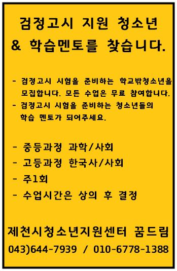Á¦Ãµ½Ãû¼Ò³âÁö¿ø¼¾ÅÍ ²Þµå¸²¿¡¼­ °ËÁ¤°í½Ã û¼Ò³â °ú ÇнÀ¸àÅä ¼±»ý´ÔÀ» ¸ðÁýÇϰí ÀÖ½À´Ï´Ù.