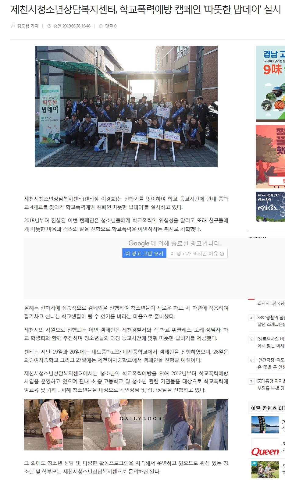 Á¦Ãµ½Ãû¼Ò³â»ó´ãº¹Áö¼¾ÅÍ, Çб³Æø·Â¿¹¹æ Ä·ÆäÀÎ 'µû¶æÇÑ ¹äµ¥ÀÌ' ½Ç½Ã