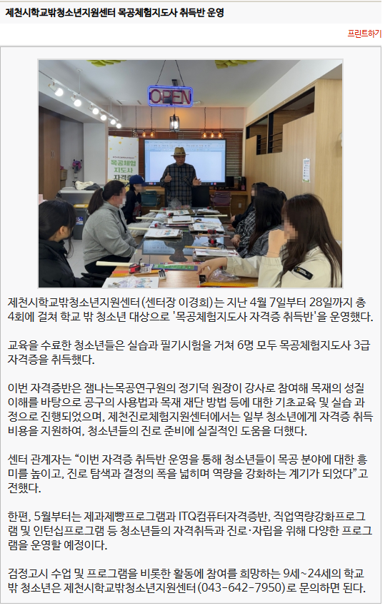Á¦Ãµ½ÃÇб³¹Ûû¼Ò³âÁö¿ø¼¾ÅÍ, ¸ñ°øÃ¼ÇèÁöµµ»ç ÀÚ°ÝÁõ Ãëµæ¹Ý ¿î¿µ