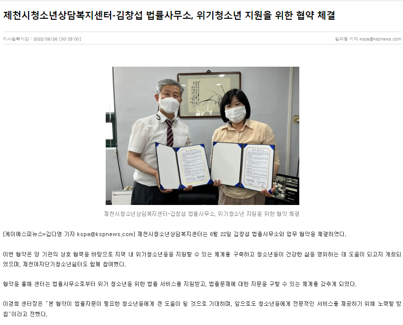 Á¦Ãµ½Ãû¼Ò³â»ó´ãº¹Áö¼¾ÅÍ-±èâ¼· ¹ý·ü»ç¹«¼Ò, À§±âû¼Ò³â Áö¿øÀ» À§ÇÑ Çù¾à ü°á