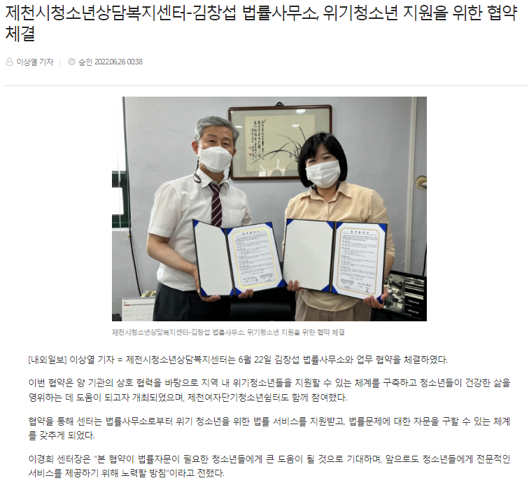 Á¦Ãµ½Ãû¼Ò³â»ó´ãº¹Áö¼¾ÅÍ-±èâ¼· ¹ý·ü»ç¹«¼Ò, À§±âû¼Ò³â Áö¿øÀ» À§ÇÑ Çù¾à ü°á