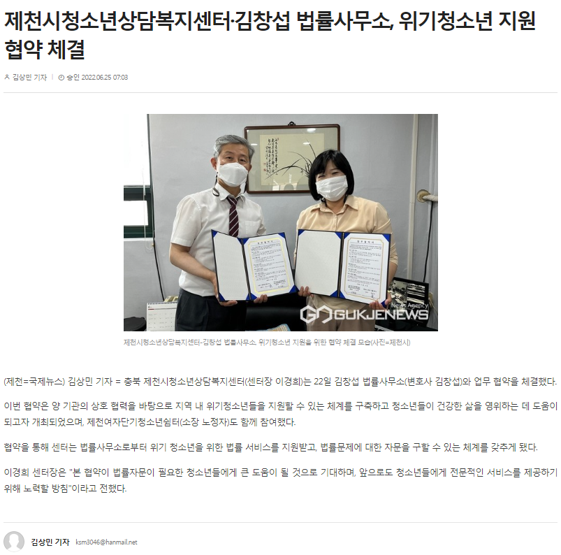 Á¦Ãµ½Ãû¼Ò³â»ó´ãº¹Áö¼¾ÅÍ-±èâ¼· ¹ý·ü»ç¹«¼Ò, À§±âû¼Ò³â Áö¿ø Çù¾à ü°á