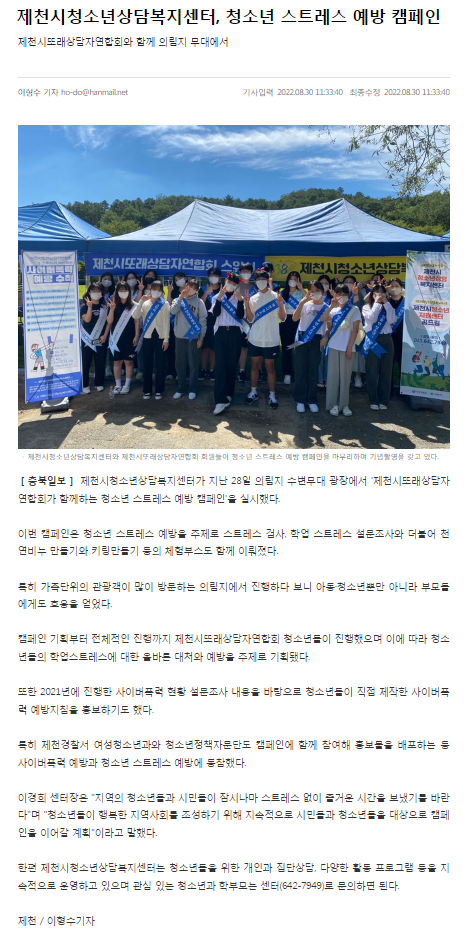 Á¦Ãµ½Ãû¼Ò³â»ó´ãº¹Áö¼¾ÅÍ, û¼Ò³â ½ºÆ®·¹½º ¿¹¹æ Ä·ÆäÀÎ ½Ç½Ã
