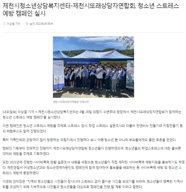 Á¦Ãµ½Ãû¼Ò³â»ó´ãº¹Áö¼¾ÅÍ-Á¦Ãµ½Ã¶Ç·¡»ó´ãÀÚ¿¬ÇÕȸ, û¼Ò³â ½ºÆ®·¹½º ¿¹¹æ Ä·ÆäÀÎ ½Ç½Ã