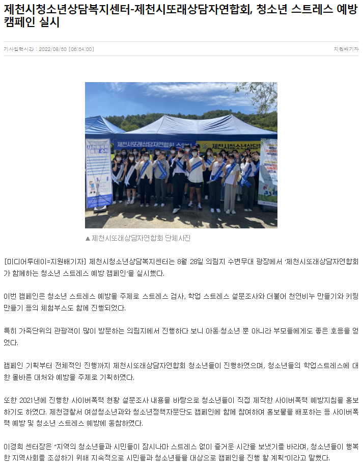 Á¦Ãµ½Ãû¼Ò³â»ó´ãº¹Áö¼¾ÅÍ-Á¦Ãµ½Ã¶Ç·¡»ó´ãÀÚ¿¬ÇÕȸ, û¼Ò³â ½ºÆ®·¹½º ¿¹¹æ Ä·ÆäÀÎ ½Ç½Ã