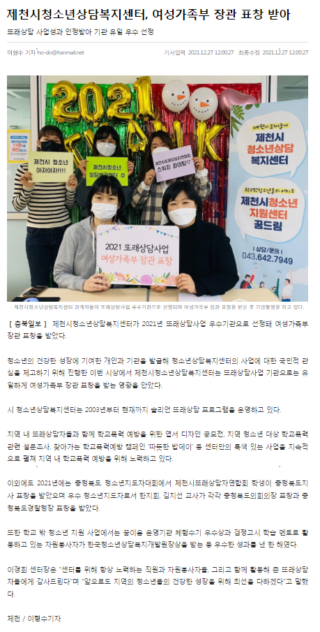 Á¦Ãµ½Ãû¼Ò³â»ó´ãº¹Áö¼¾ÅÍ, ¿©¼º°¡Á·ºÎ Àå°ü ǥâ ¹Þ¾Æ