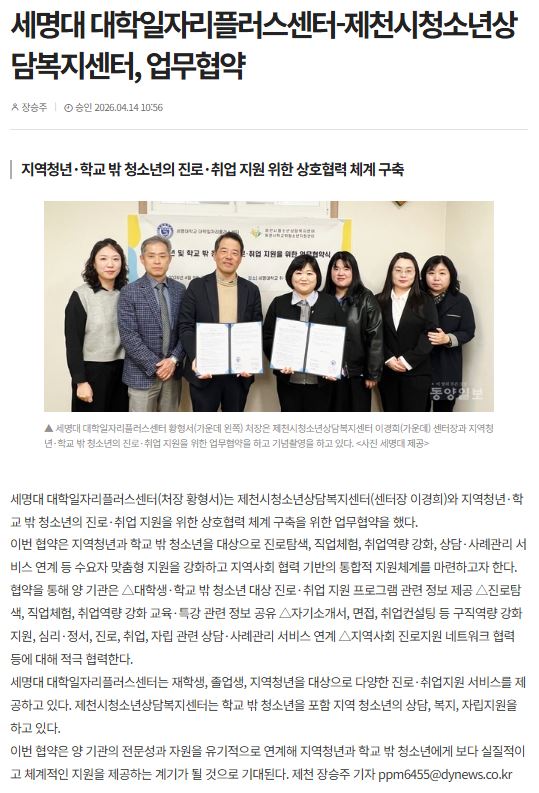 [µ¿¾çÀϺ¸] ¼¼¸í´ë ´ëÇÐÀÏÀÚ¸®Ç÷¯½º¼¾ÅÍ-Á¦Ãµ½Ãû¼Ò³â»ó´ãº¹Áö¼¾ÅÍ, ¾÷¹«Çù¾à